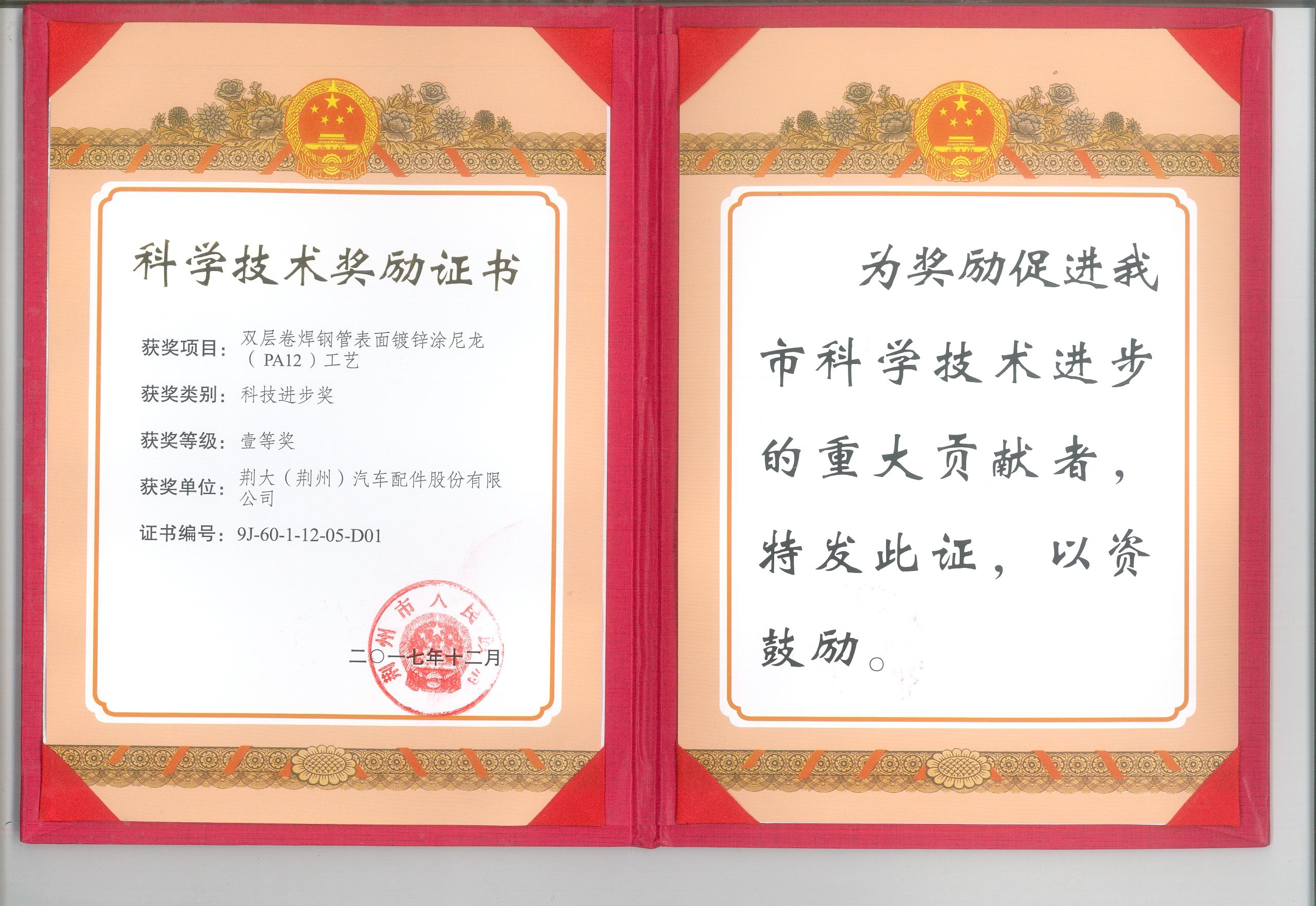 《鋼管涂尼龍工藝》獲得2017年荊州市科技進(jìn)步一等獎(jiǎng)